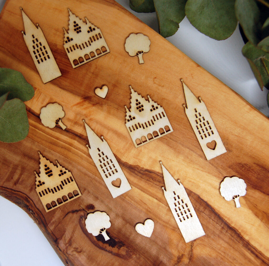 Unsere kreativen Ideen setzen wir mit Holz und Filz um. Der Laser eignet sich hervorragend, um eigene Formen auszuschneiden. So entstehen einzigartige Unikate wie der kleine Dom oder die Streudeko aus Holz.