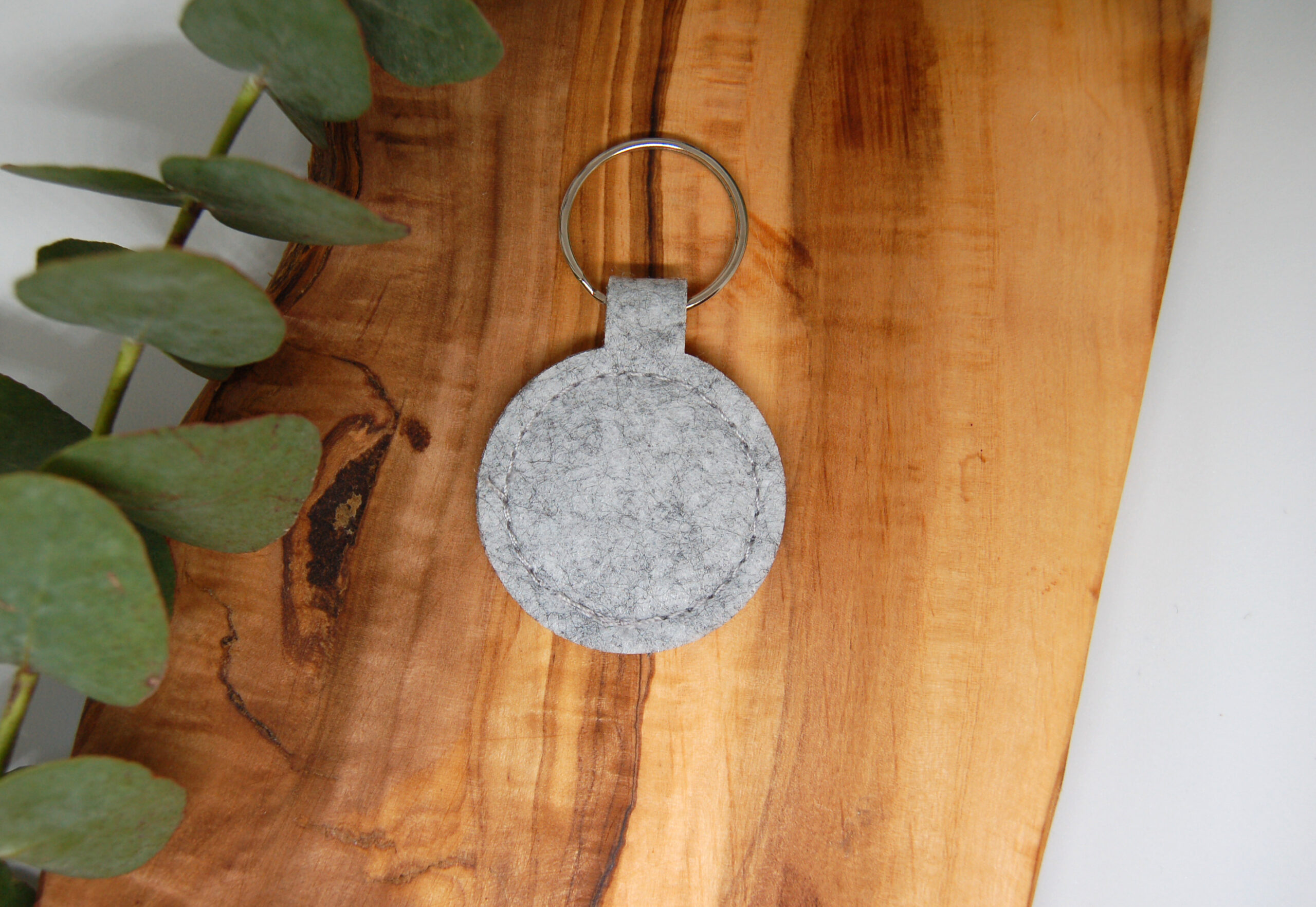 Schlüsselanhänger Paderborn – runder Filzanhänger in hellgrau mit 3 Hasen Motiv